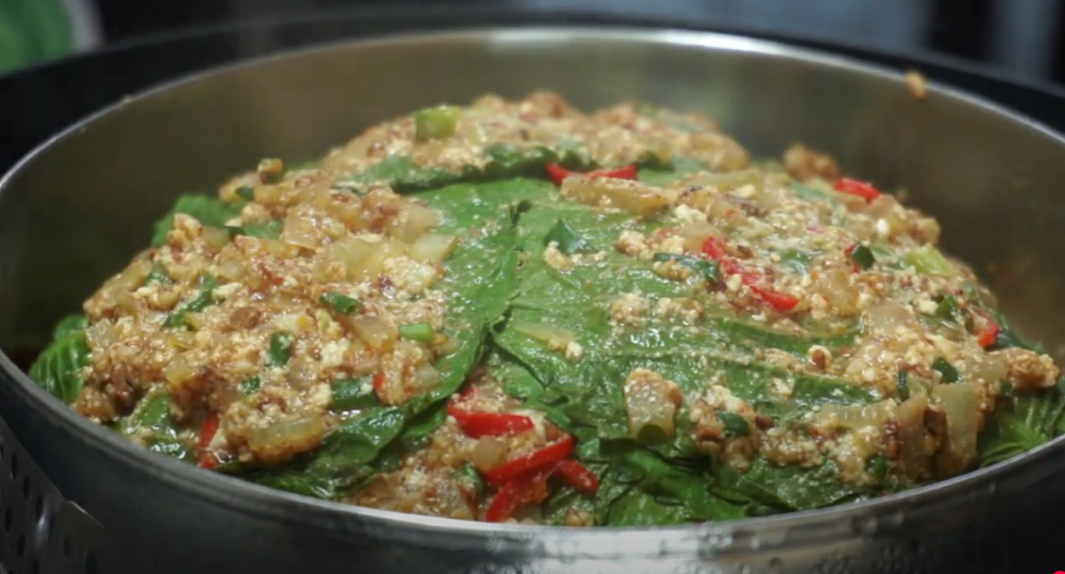 된장과 다양한 채소가 들어간 깻잎찜, 찌는 과정 중 뜨겁게 증기가 올라오는 모습