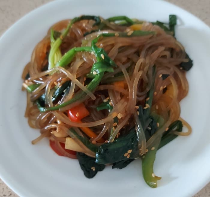 흰 접시에 담긴 잡채. 시금치, 당근, 피망, 양파 등 다양한 채소가 어우러져 있고, 참깨가 고명으로 뿌려져 있다